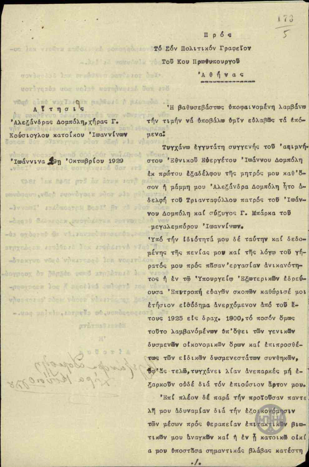 Η Δομπόλη, σε μία προσπάθεια να εξασφαλίσει τα προς το ζην, προέβη στην αποστολή τριών παρακλητικών επιστολών. Με την πρώτη, της 19ης Οκτωβρίου 1929, την οποία απηύθυνε στο Πολιτικό Γραφείο του πρωθυπουργού Ελευθέριου Βενιζέλου, ζητούσε την αύξηση του ετήσιου επιδόματος, το οποίο έπαιρνε από την Επιτροπή Ευαγών Σκοπών του Υπουργείου Εξωτερικών, ή την εφάπαξ παραχώρηση χρηματικού ποσού για την επισκευή του σπιτιού της. Η επιστολή παρέχει επίσης την ενδιαφέρουσα πληροφορία ότι ο όρος της διαθήκης του Ιωάννη Δομπόλη, σύμφωνα με τον οποίον μέρος της περιουσίας του θα περνούσε στους συγγενείς του, δεν εφαρμόστηκε ποτέ.