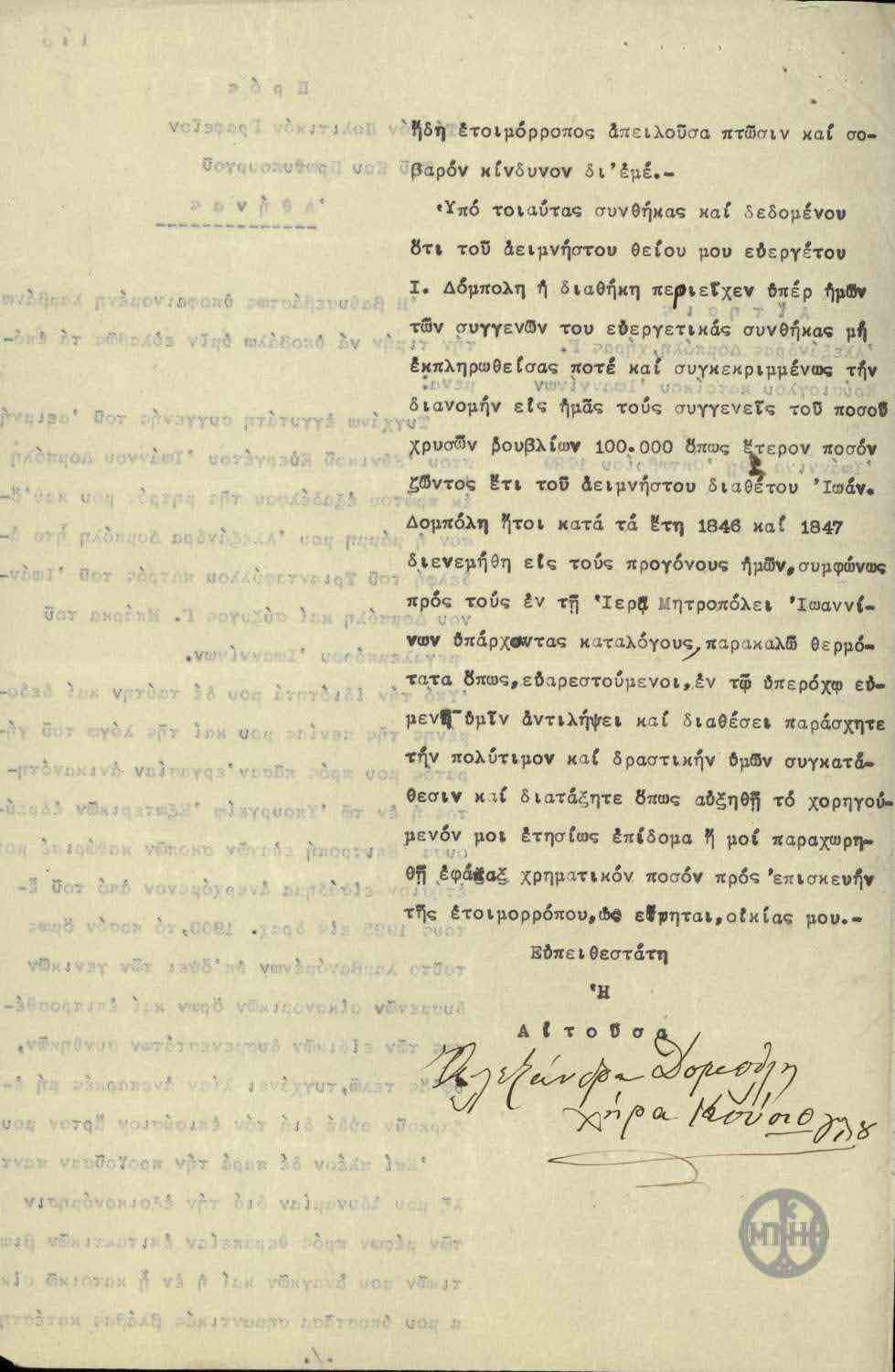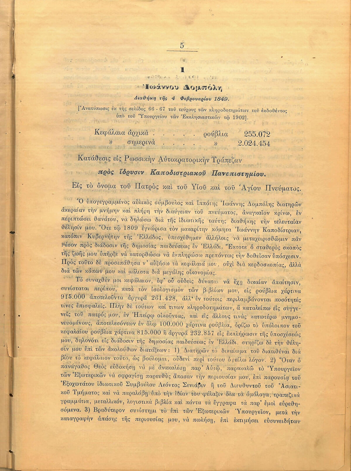 (Μεταφρασμένο αντίγραφο της διαθήκης του Ιωάννη Δομπόλη, Αλκιβιάδη Κρασσά, Διαθήκαι και δωρεαί υπέρ του Εθνικού Πανεπιστημίου μετά διαφόρων σχετικών εγγράφων από ιδρύσεως αυτού μέχρι τέλους του 1899, Αθήνα 1900, Ιστορικό Αρχείο Εθνικού και Καποδιστριακού Πανεπιστημίου Αθηνών.)