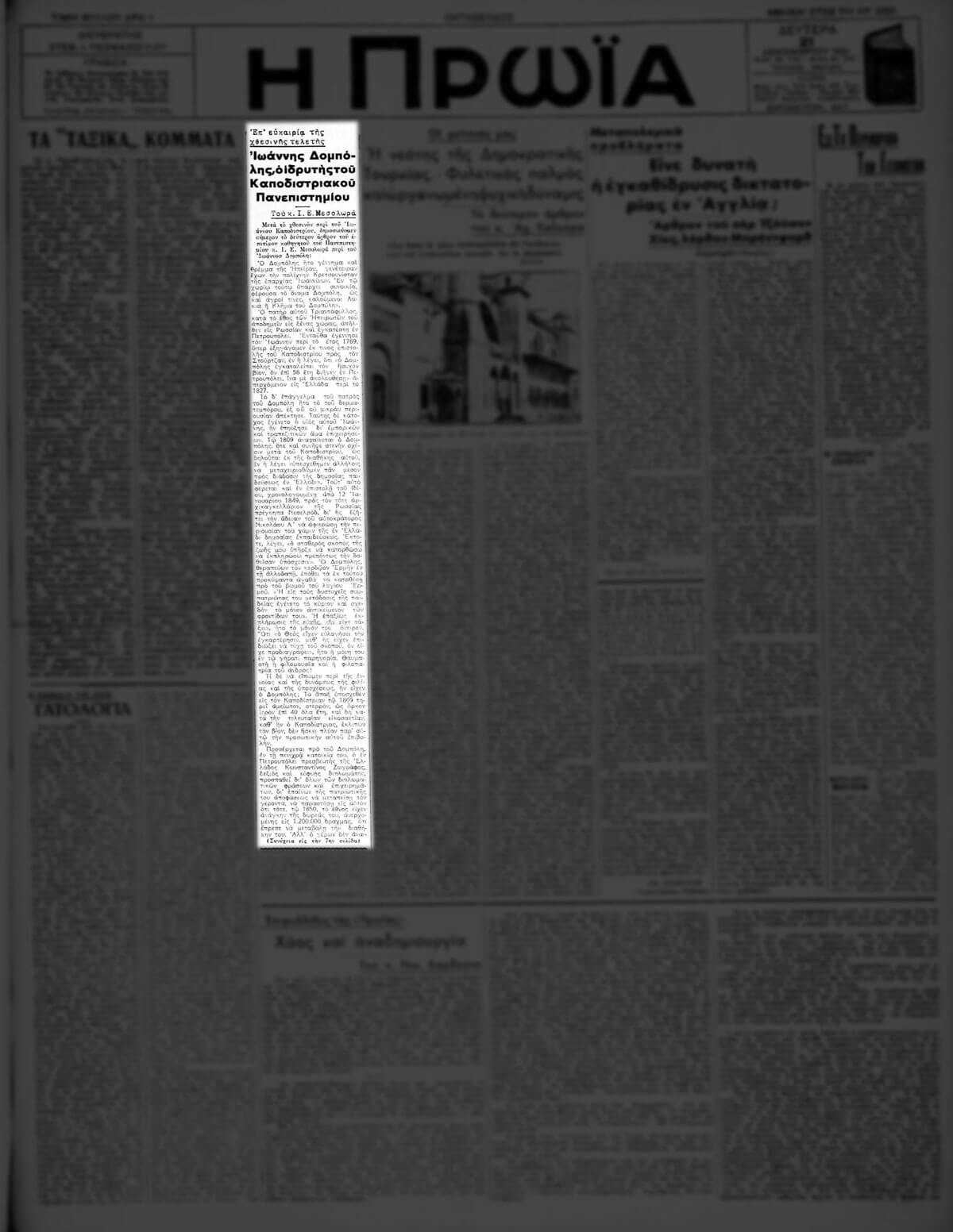 Με το άρθρο Το κληροδότημα του Γραμματέως του Καποδιστρίου, της 30ης Μαΐου 1894, η εφημερίδα Ακρόπολις ενημέρωσε τους αναγνώστες της για την υπόθεση του άγνωστου στο ευρύ κοινό Ιωάννη Δομπόλη και το υπέρογκο ποσό που κληροδότησε για την ίδρυση του Καποδιστριακού Πανεπιστημίου. Ενδιαφέρον παρουσιάζει το ότι σε παραπλήσια στήλη διαφημιζόταν η σειρά εικονογραφημένων περιοδικών του φιλολόγου και συγγραφέα Τρύφωνα Ε. Ευαγγελίδη (1863-1941) με τίτλο Ιστορία του Καποδιστρίου.