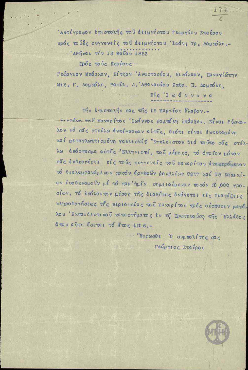Ο τραπεζίτης Γεώργιος Σταύρος (1788-1869), με επιστολή που συνέταξε στις 13 Μαΐου 1853, ενημέρωσε τους συγγενείς του Ιωάννη Δομπόλη ότι η διαθήκη του μεγάλου ευεργέτη είχε βρεθεί. Ωστόσο, τους κοινοποίησε μόνο ένα μικρό της απόσπασμα, αυτό που αφορούσε τους ίδιους, καθώς, όπως σημείωσε, τό ὑπόλοιπον μέρος τῆς διαθήκης ἀνάγεται εἰς διατάξεις κληροδοτήσεως τῆς περιουσίας τοῦ Μακαρίτου πρός σύστασιν μεγάλου Ἐκπαιδευτικοῦ καταστήματος ἐν τῇ Πρωτευούσῃ τῆς Ἐλλάδος ὅπου αὕτη ἔσεται τό ἔτος 1906.