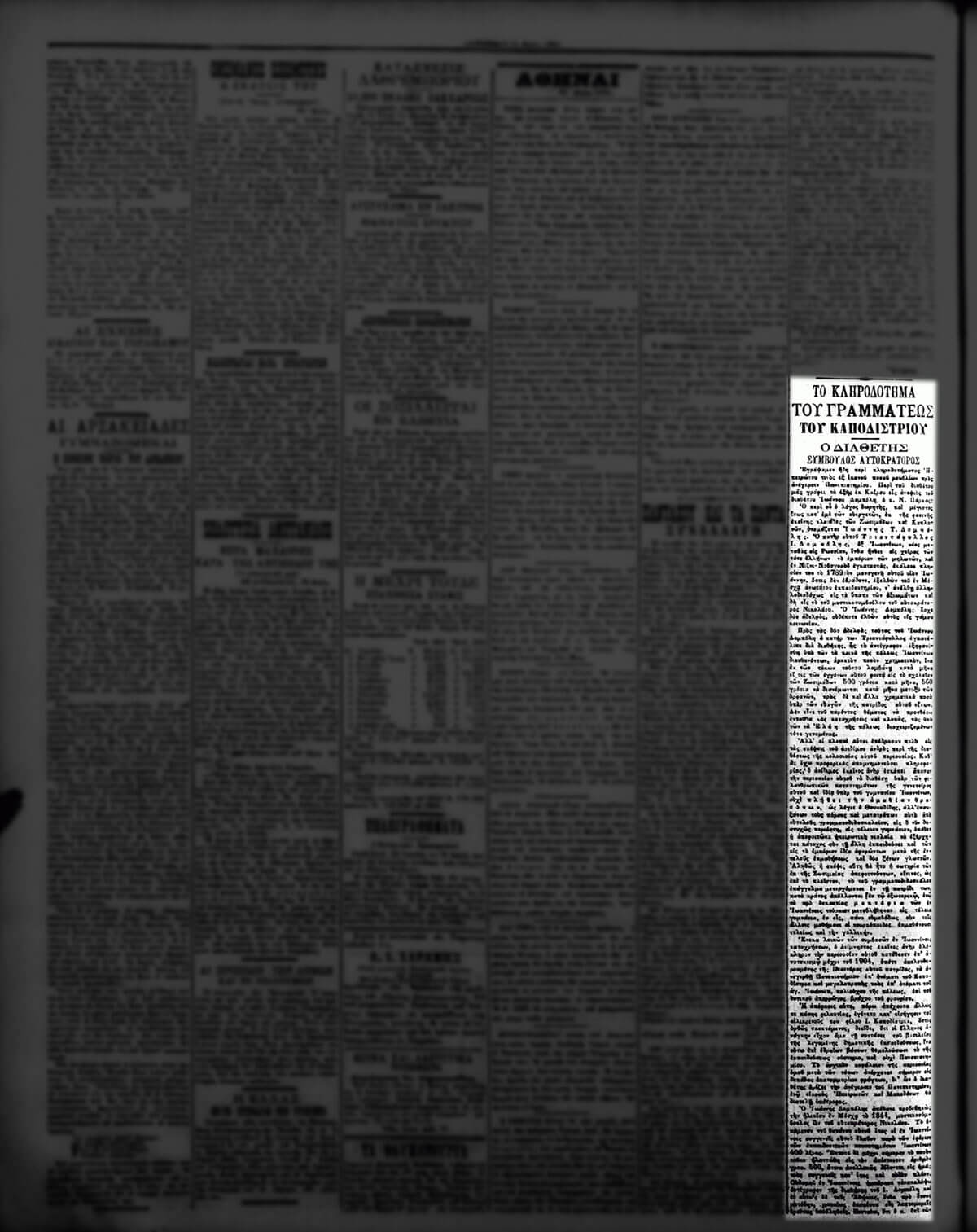 Σε παραπλήσια στήλη της εφημερίδας, δημοσιεύτηκαν οι λόγοι που απήγγειλαν, κατά την τελετή των αποκαλυπτηρίων, ο καθηγητής της Ιστορίας των Μέσων και Νεωτέρων Χρόνων στη Φιλοσοφική Σχολή Μιχαήλ Δ. Βολονάκης (1875-1950) και ο Προπρύτανης και καθηγητής της Οργανικής Χημείας στη Σχολή Θετικών Επιστημών Γεώργιος Θ. Ματθαιόπουλος (1873-1958).