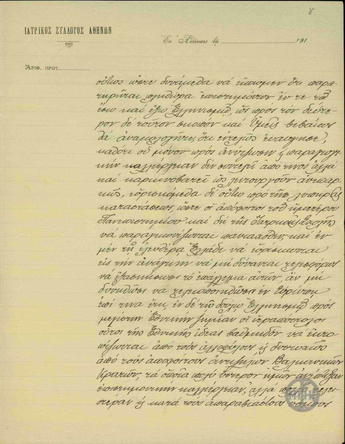 Στις 9 Ιουνίου 1911, ο Ιατρικός Σύλλογος Αθηνών απέστειλε υπόμνημα στον πρωθυπουργό Ελευθέριο Βενιζέλο (1864-1936), με το οποίο εξέφραζε τη γνώμη του σχετικά με το ζήτημα του νέου πανεπιστημιακού νομοσχεδίου.